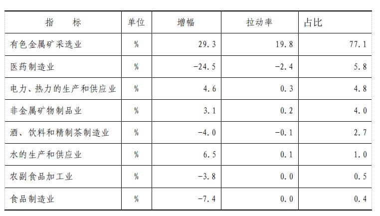 1-8月,有色金属矿采选业增加值同比增长29.3%,增加值占全市的77.1%,对规上工业增加值的贡献率达119.8%,拉动全市规上工业增加值增长19.8个百分点。
